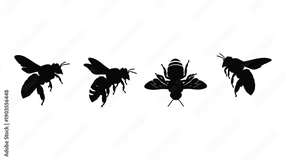 Obraz na plátně Four distinct black silhouettes of bees showcasing different poses and styles Ve