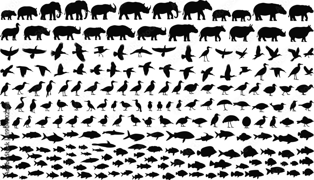 Obraz na plátně Black silhouette collection of various wild animals birds and fish including elephants rhinos and eagles isolated on white background for design