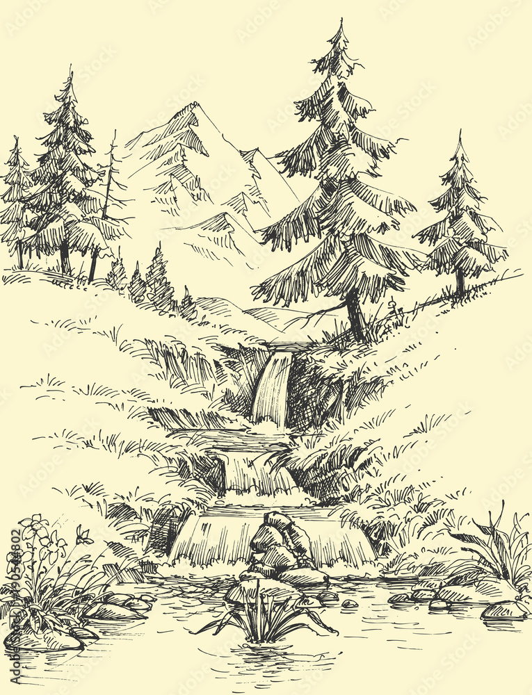 Obraz na plátně A creek in the mountains. Alpine waterfall landscape