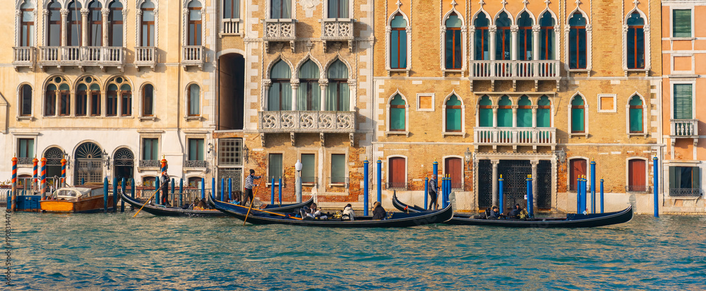 Obraz na plátně Lively Venice canal scene with gondolas, gondoliers and tourists along colorful historic buildings