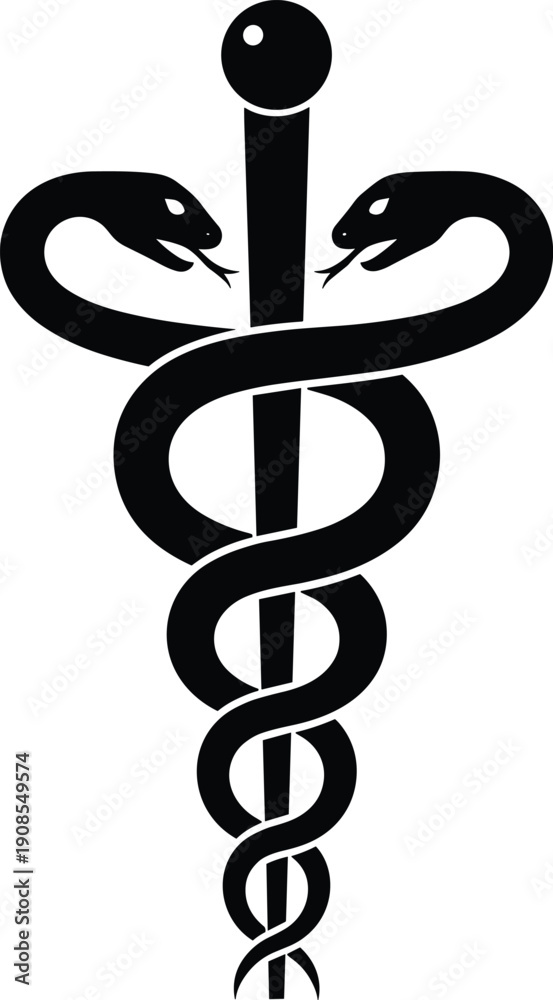 Obraz na plátně Black and white caduceus medical symbol with two snakes entwined around a winged staff for healthcare and pharmacy logo design concepts