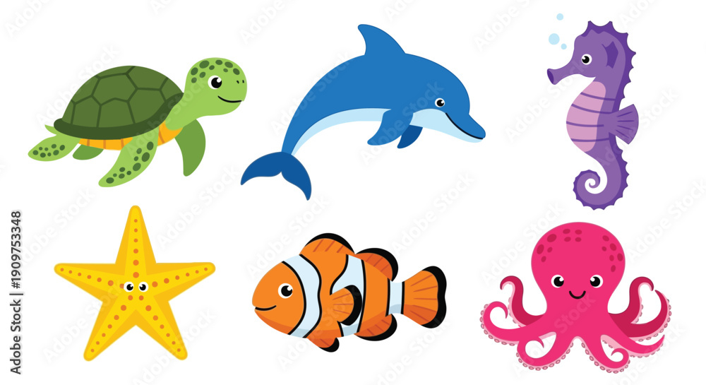 Obraz na plátně Colorful cartoon illustrations of various marine animals and a starfish