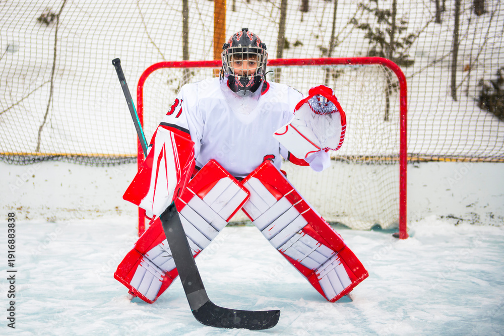 Obraz na plátně Ice hockey teen goaler outside in uniform