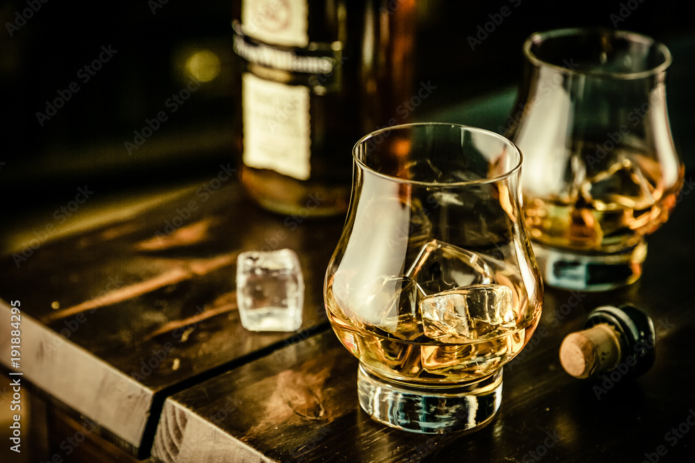 Obraz na plátně Whiskey in glasses with ice on rustic background