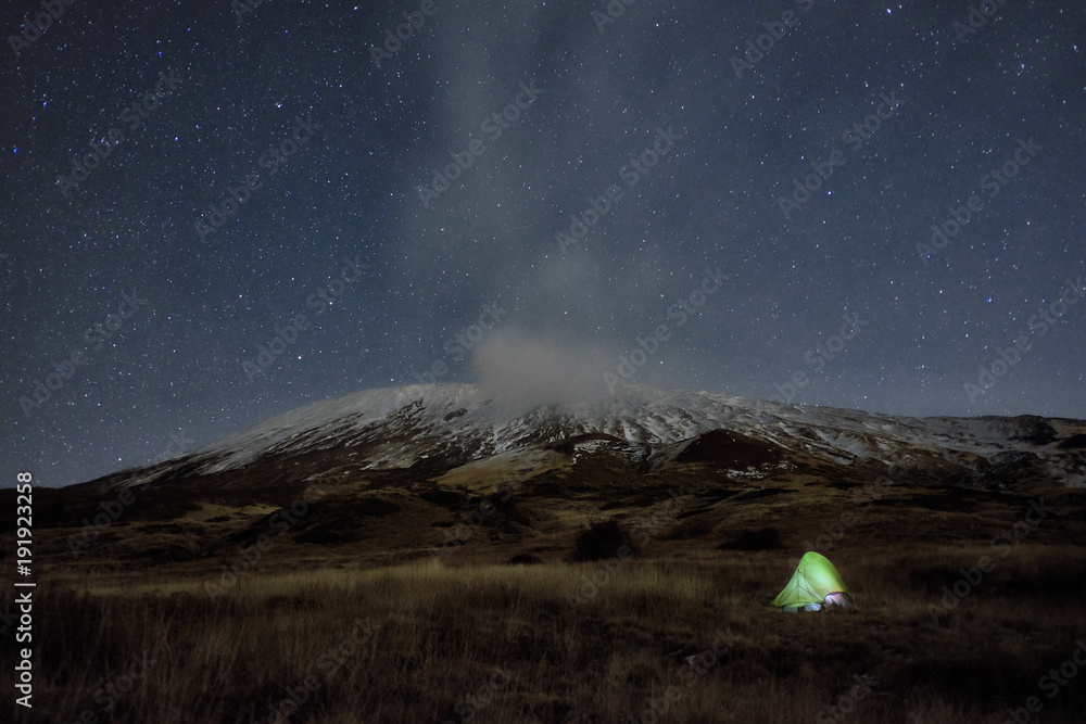 Obraz na plátně Lighting Tent Under Winter Etna Mount And Starry Night, Sicily