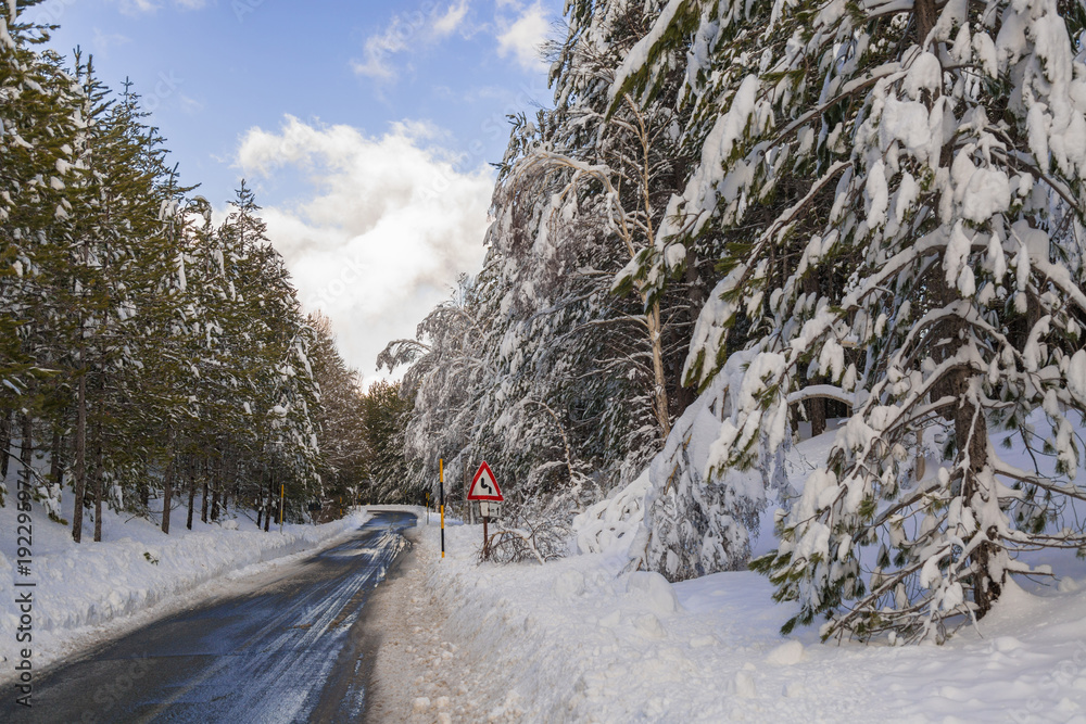 Obraz na plátně Snow on the needles of pine tree in the wood in winter - Volcano Etna Park, Sici