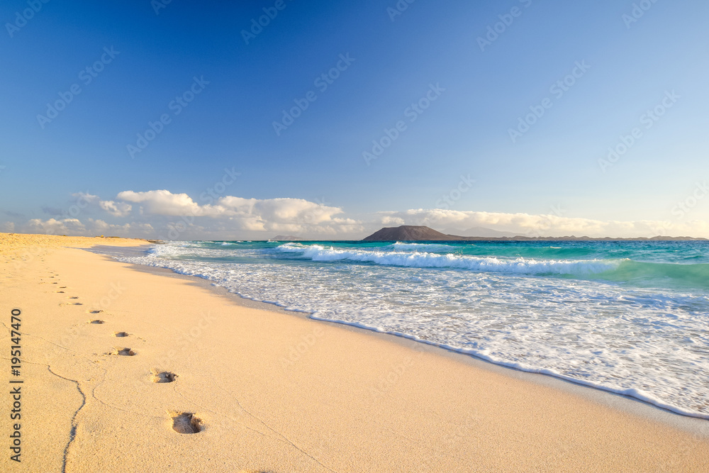 Obraz na plátně Stunning morning view of the islands of Lobos and Lanzarote seen from Corralejo Beach (Grandes Playas de Corralejo) on Fuerteventura, Canary Islands, Spain, Europe