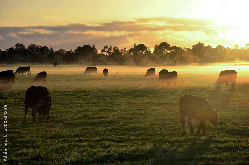 Obraz na plátně Rural landscape with herd of cows in morning fog at sunrise in Morpeth, NSW, Aus