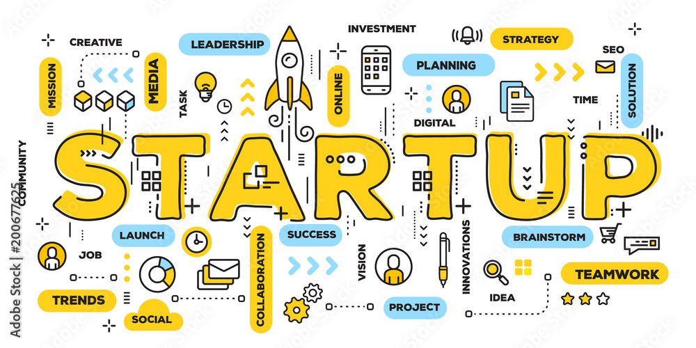 Obraz na plátně Vector creative illustration of business startup yellow word lettering typography with line icons and tag cloud on white background