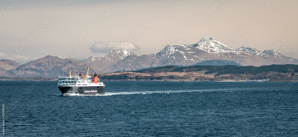 Obraz na plátně Ferry sailing between Oban and the Isle of Mull with snow capped highland peaks