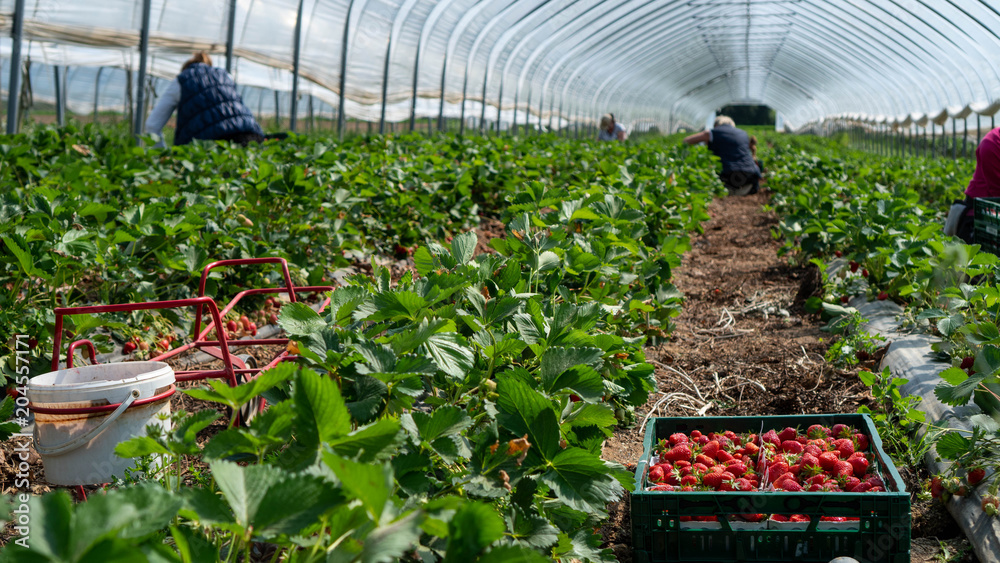 Obraz na plátně Field with strawberry harvest, farmer picking strawberries, organic farming conc