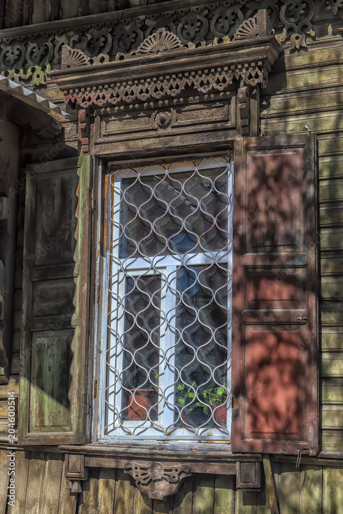 Obraz na plátně Window with carving architraves and closed shutters.