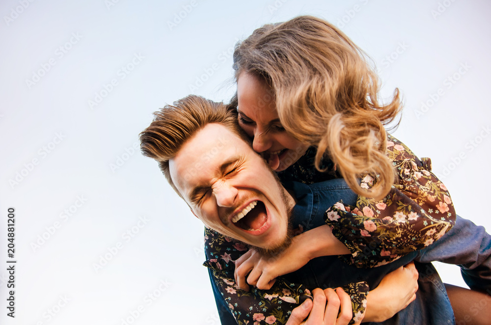 Obraz na plátně The guy rolls his beloved girl on his back against the backdrop of sky