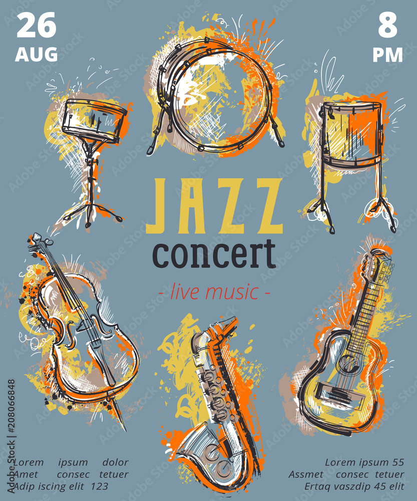 Obraz na plátně Jazz music party with musical instruments