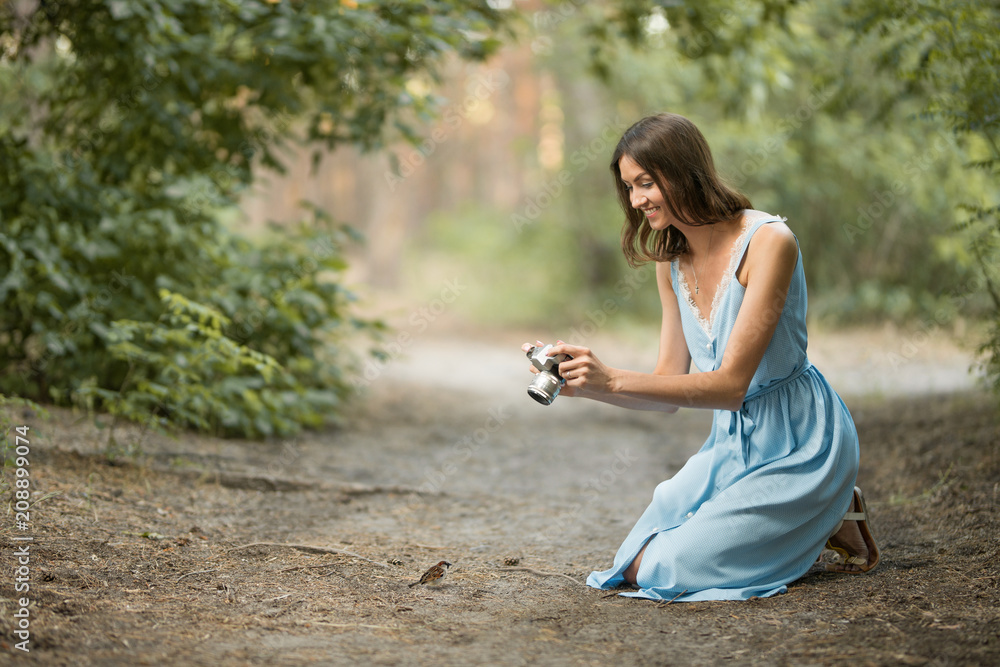 Obraz na plátně A girl with a smile in a forest or park with a camera takes a picture of a bird