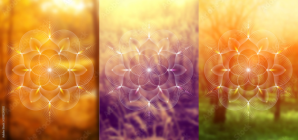 Obraz na plátně Set of three template for card or poster, vertical format; Spiritual abstract sacred geometry on wonderful blurred background; Flower of life and lotus; Yoga, meditation and relax