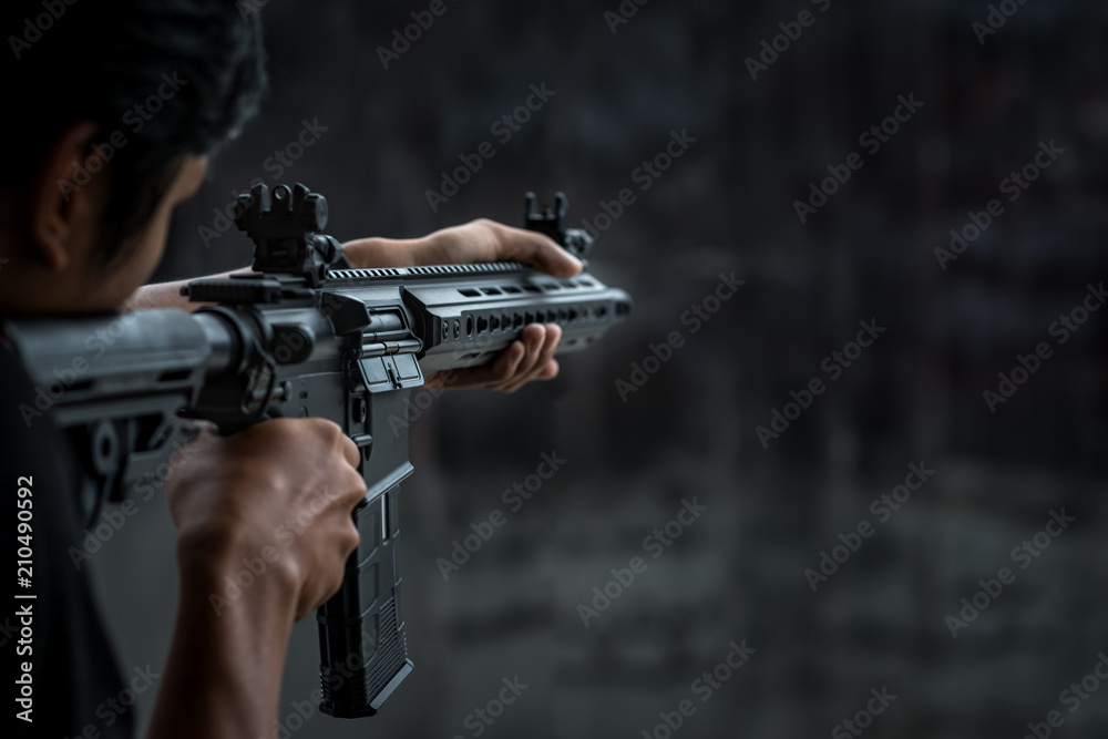Obraz na plátně Man holding gun aiming pistol in shooting range