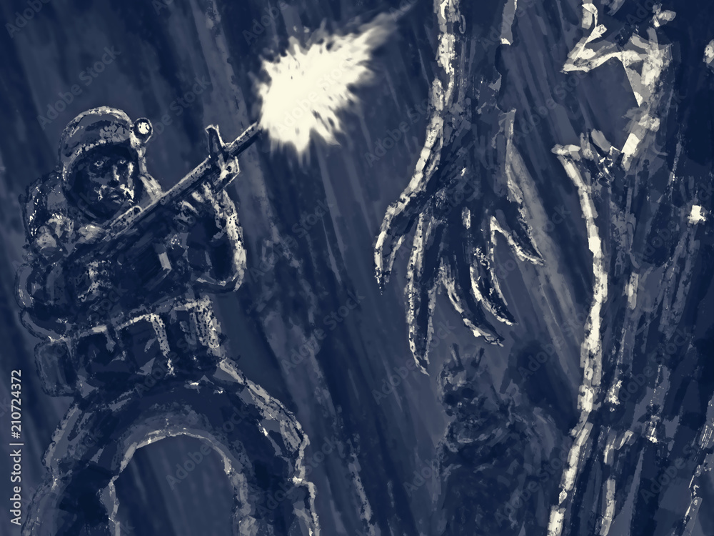Obraz na plátně Inside the tomb the plunderer soldier met a mummy.