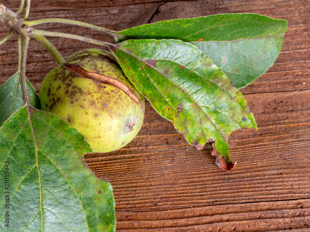 Obraz na plátně Ill apple tree, split and scarred fruit and leaves. Scab.