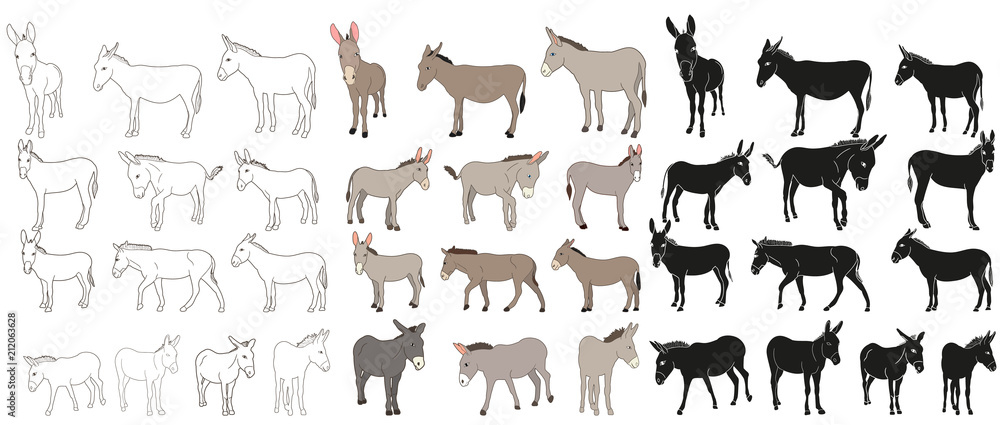 Obraz na plátně vector isolated donkey, mule, outline, collection of silhouettes