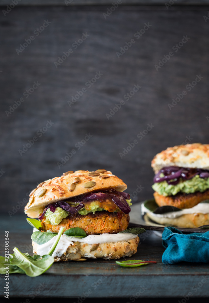 Obraz na plátně Vegetarian burger with chickpeas and guacamole