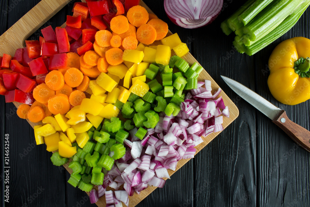 Obraz na plátně Chopped fresh vegetables on the cutting board on the black wooden background