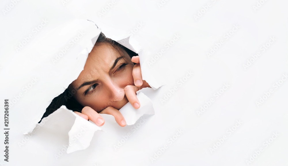 Obraz na plátně Portrait of a woman looking through the hole in white paper