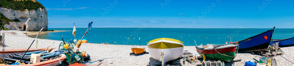 Obraz na plátně Romantic fisherboats at Yport Habour and Beach side in Normandy during cloudy sk