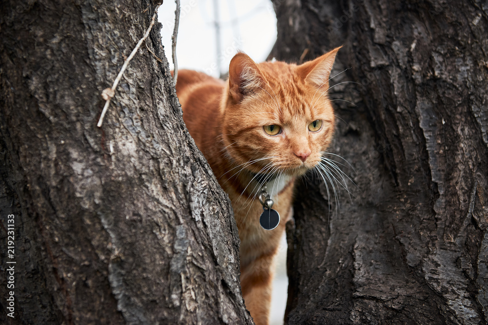 Obraz na plátně Ginger red tabby cat in a tree with long white whiskers up in a tree