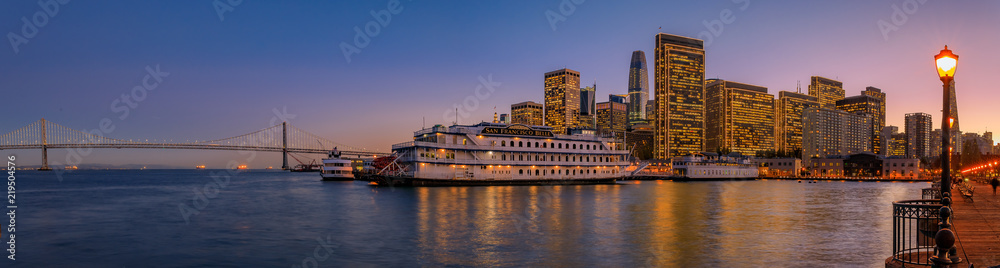 Obraz na plátně San Francisco Belle and downtown at Christmas from wooden Pier 7 at sunset