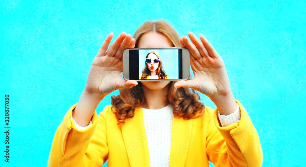 Obraz na plátně woman takes picture self portrait on smartphone on colorful blue background