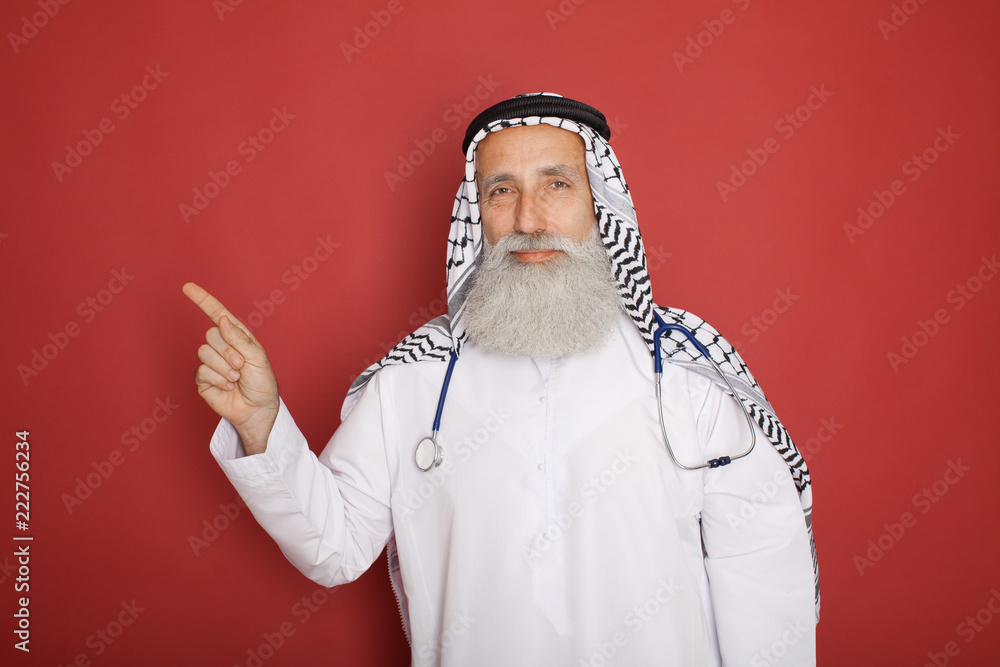 Obraz na plátně Arabic old bearded hospital doctor with stethoscope posing on red background