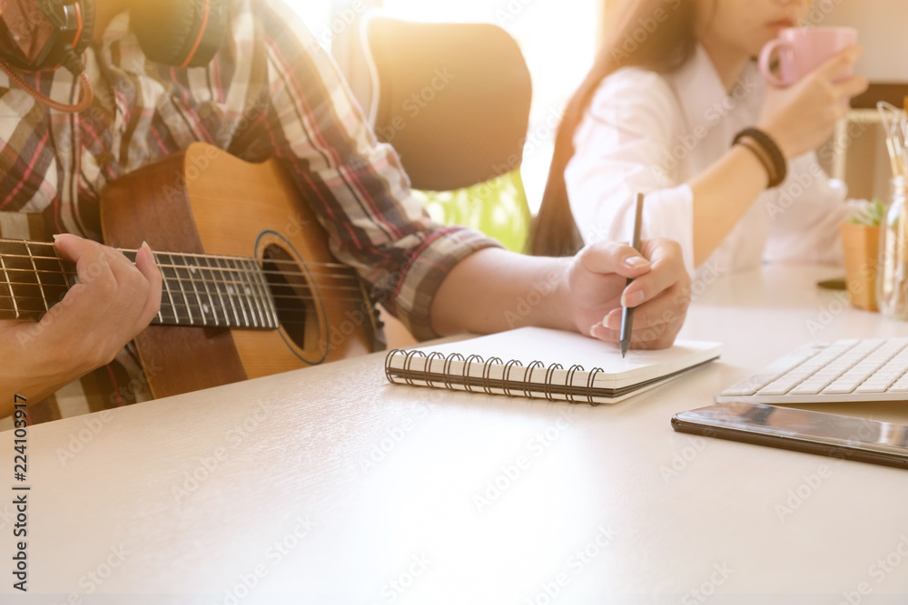 Obraz na plátně musician songwriter working with guitar and notepad paper on workplace with cropped shot