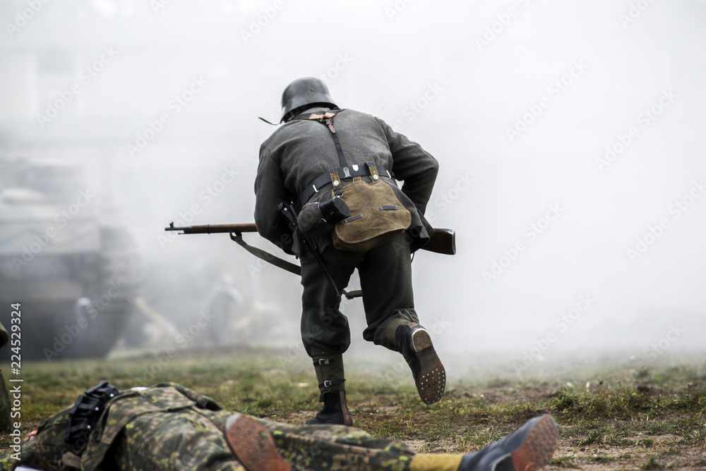 Obraz na plátně Historical reenactment of soldiers during the Second World War, view from the ba
