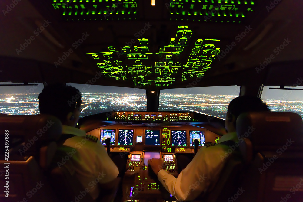 Obraz na plátně Asian airline pilots were operating commercial aircraft on approach phase over city on the night