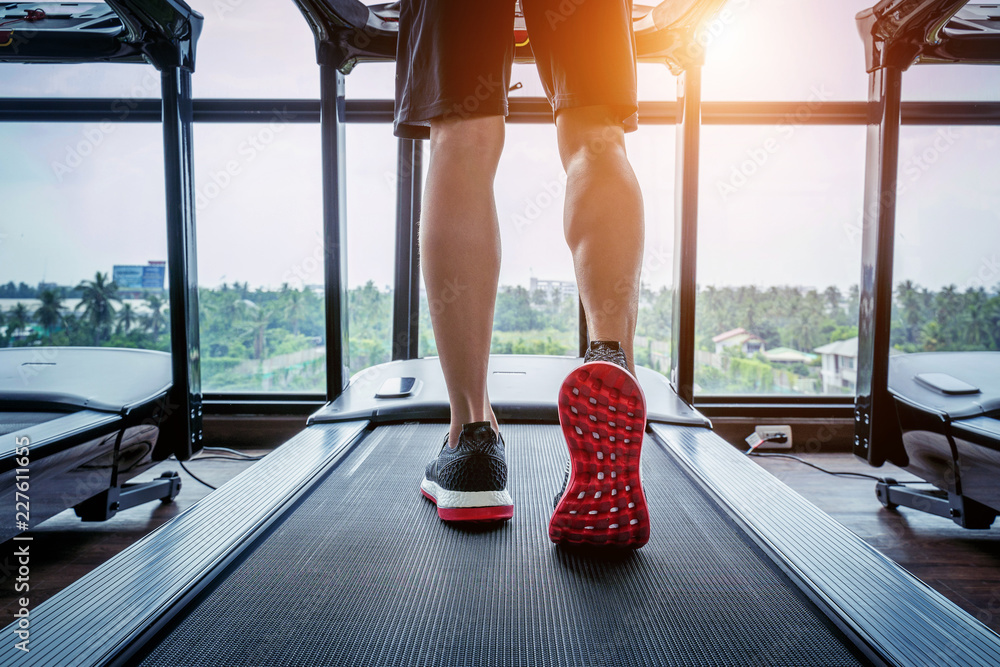 Obraz na plátně Male feet in sneakers running on the treadmill at the gym
