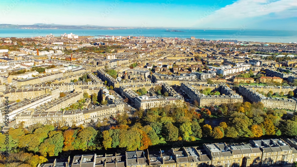 Obraz na plátně Aerial image looking across the north of the city of Edinburgh to Leith docks and the Firth of Forth on a bright autumn day