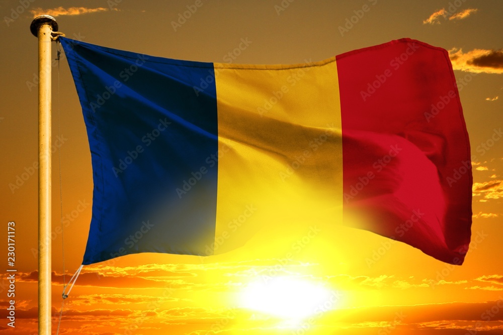 Obraz na plátně Romania flag weaving on the beautiful orange sunset with clouds background