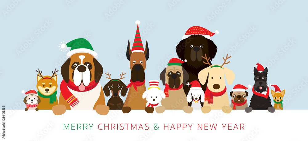 Obraz na plátně Dogs Wearing Christmas Costume Holding Banner