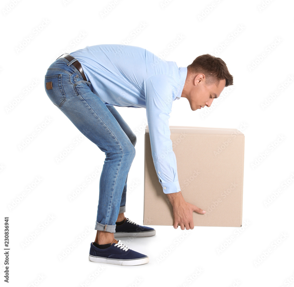 Obraz na plátně Full length portrait of young man lifting heavy cardboard box on white background