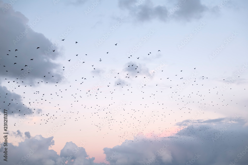 Obraz na plátně Pink skies with clouds during sunset with many birds flying