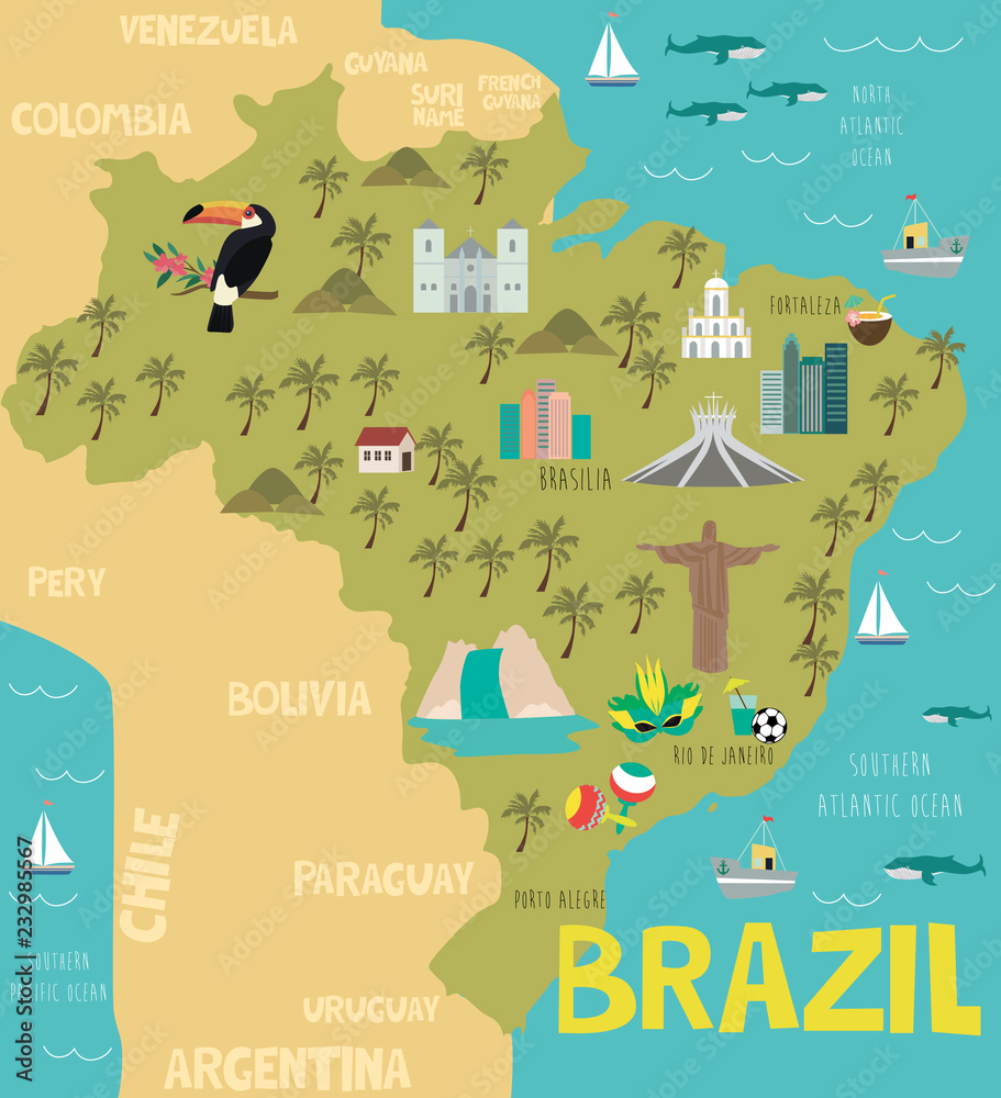 Obraz na plátně Illustration map of Brazil with nature, animals and landmarks