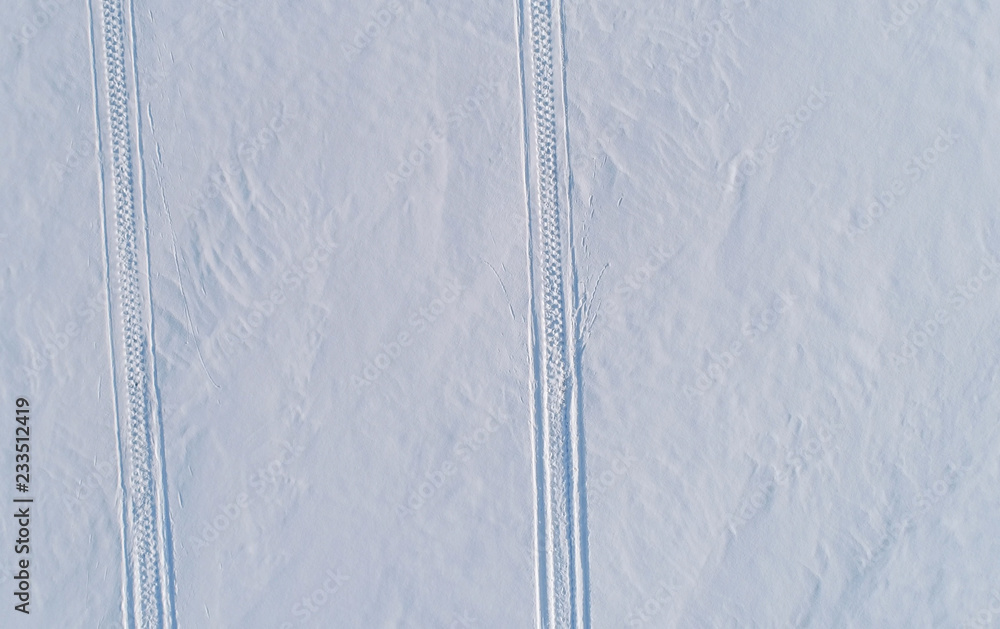 Obraz na plátně Traces of the snowmobile on snow. Top view. Aerial foto.