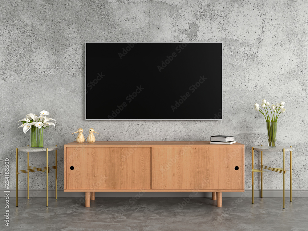 Obraz na plátně Widescreen TV and sideboard in living room, loft style, 3D rendering