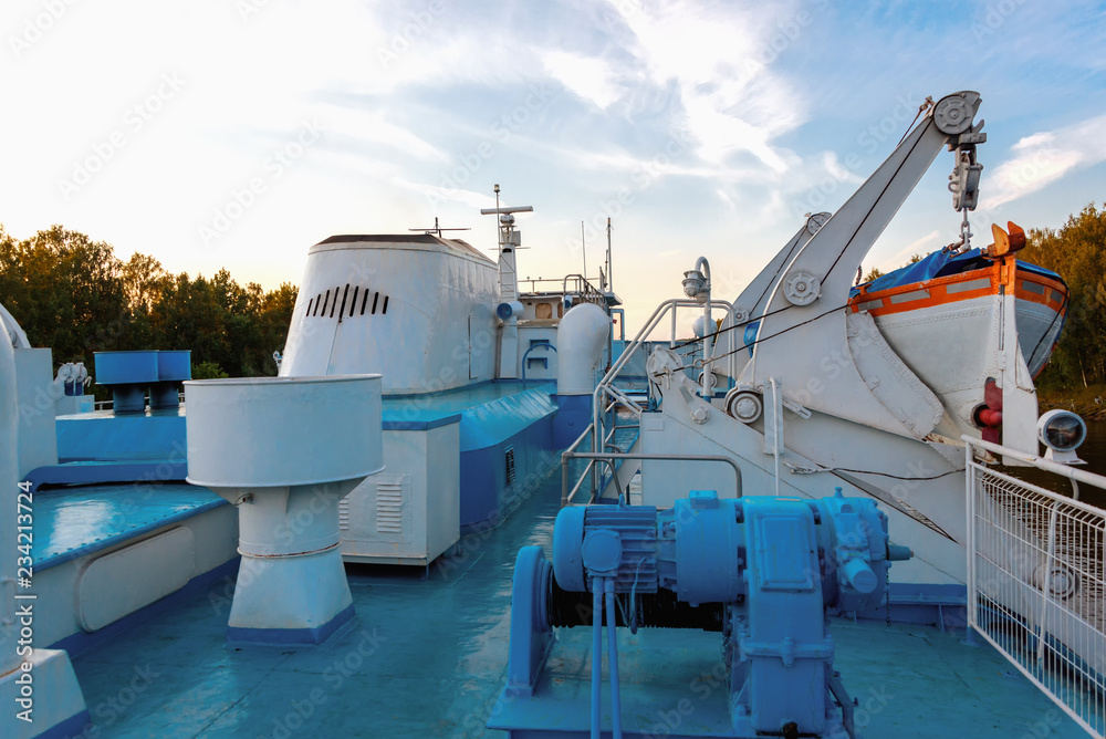 Obraz na plátně Rescue boat and other mechanisms on the upper deck of the ship