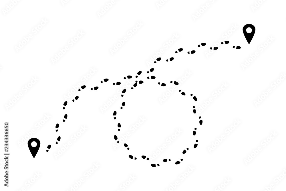 Obraz na plátně Man footprints and map pins isolated on white background