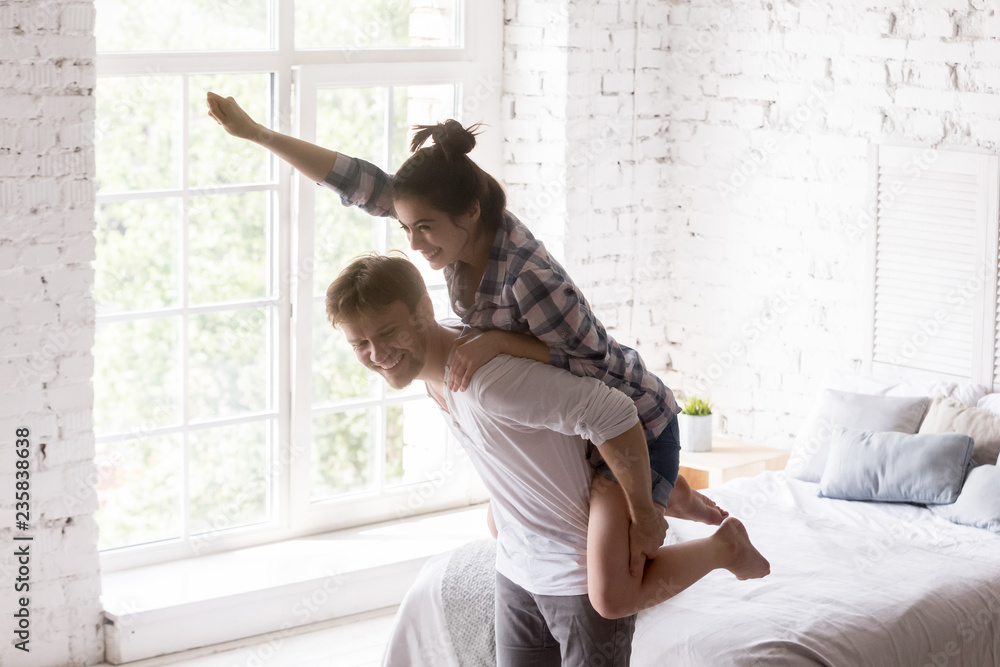 Obraz na plátně Excited happy young woman piggyback man in bedroom, loving couple having fun tog