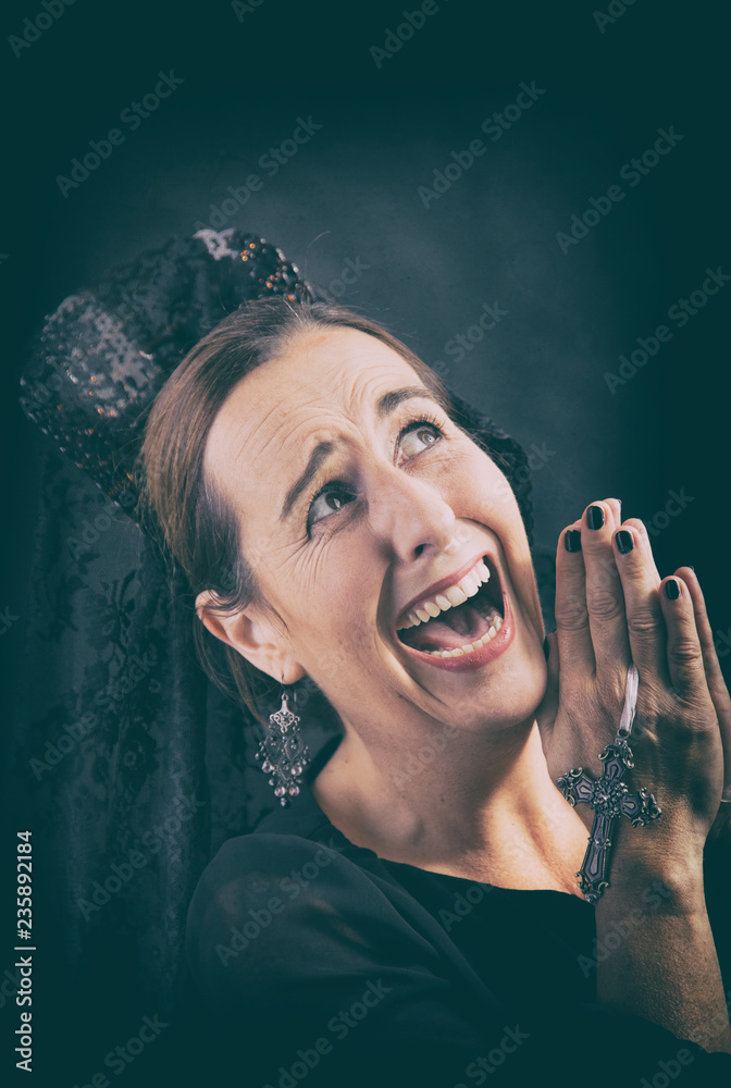 Obraz na plátně Spanish lady with interlocking hands praying, looking up in fear wearing traditional clothing: black veil / mantilla and a high comb / peineta