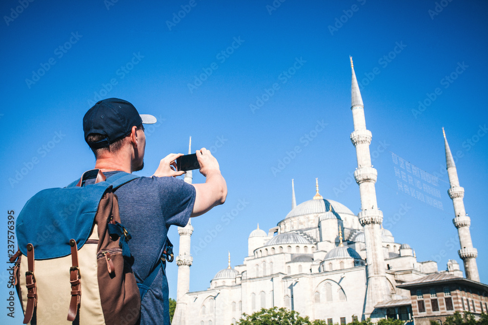 Obraz na plátně Tourist photographs the Blue Mosque in Istanbul in Turkey for memory
