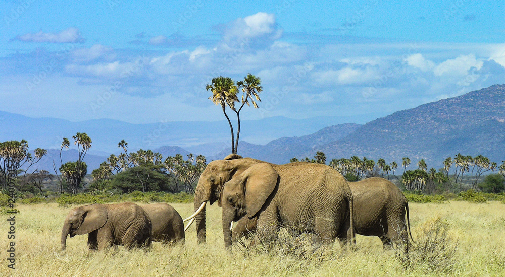 Obraz na plátně Family of elephants strolling through Samburu grasslands